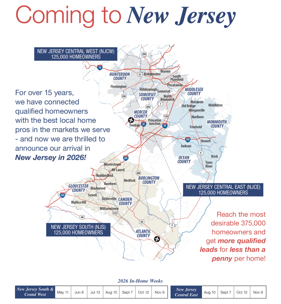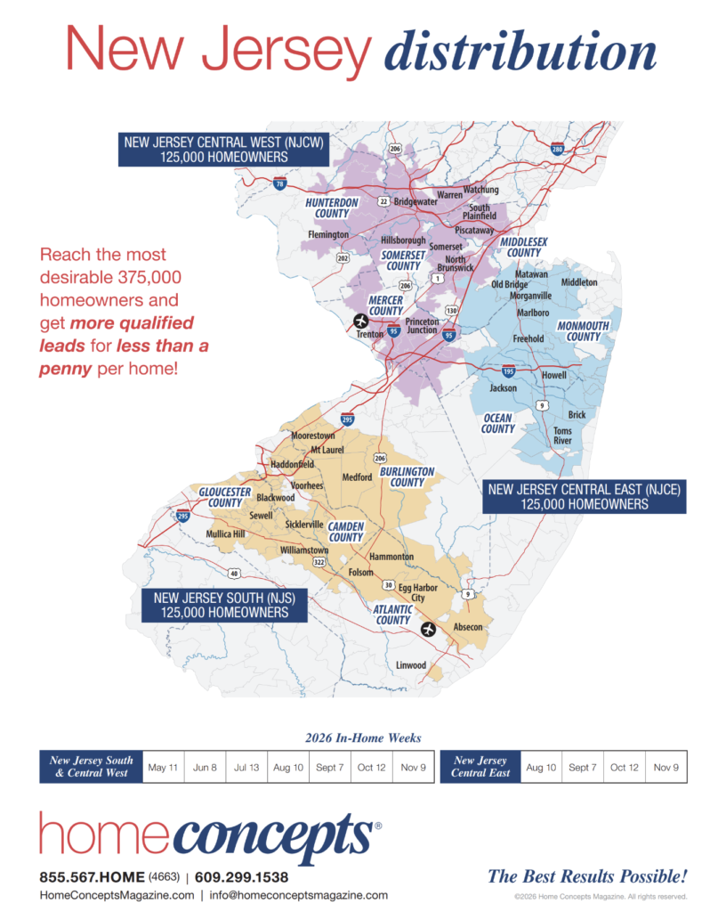 South Jersey is its own market. It’s not “Central West” and it’s not “Central East,” and homeowners behave differently depending on whether they’re in Camden County suburbs, Gloucester County communities like Woodbury and Glassboro, Burlington County neighborhoods near Mount Holly and Burlington Township, or shore and shore-adjacent areas throughout Atlantic and Cape May counties. Home Concepts Magazine is designed to help you show up locally and professionally in the places you actually want to work, so you’re not paying for attention outside your service footprint.